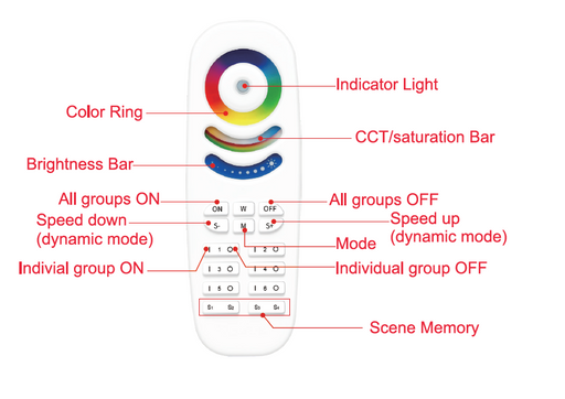 Fjernkontroll for styring av DIM - CCT - RGB - RGBW eller RGB+CCT.   Fjernkontrollen har 6 forskjellige soner som kan styres separat eller man kan ...